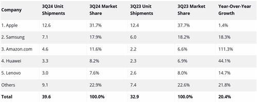 킨들을 판매하는 아마존은 1년 전보다 출하량이 2배 이상인 111.3% 증가하며 시장 점유율(11.6%)이 5위에서 3위로 뛰어올랐다.