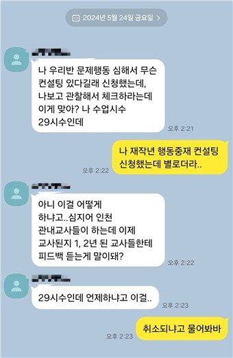 아울러 학부모들의 민원에 시달린 정황도 드러났다. A 교사는 '교사가 아파트 단지 안에 들어와서 등교지도 해달라시는데 학교에서 그렇게 해줘야 한다고 하네' 등 내용의 메시지를 동료에게 전달했다.