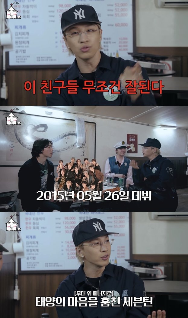 이어 태양은 "요즘 다 잘하고 멋있고 예쁜 분들이 너무 많다"며 "신인이 아니어서 얘기하기가 그런데 '뱅뱅뱅'으로 활동했을 당시 세븐틴이 리허설 하는 것을 보고 '이 친구들 무조건 잘 될 것 같다'고 생각했다"고 말했다.
