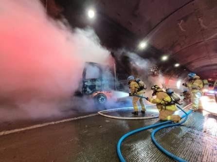 (수원=연합뉴스) 류수현 기자 = 6일 오전 6시 26분께 경기 광주시 초월읍 3번 국도 성남방향 백마터널에서 5t 화물차량에 불이 났다.