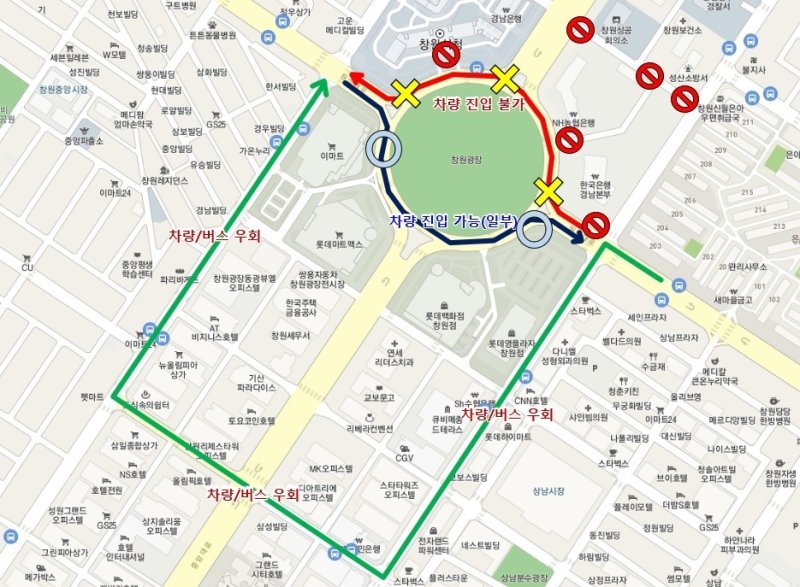 창원시청(정우상가)에서 창원광장 방향으로는 진입할 수 있지만, 상남시장(은아아파트)에서 창원광장 방향은 통제돼 버스 등 차량은 국민은행 사거리 방향으로 우회해야 한다.
