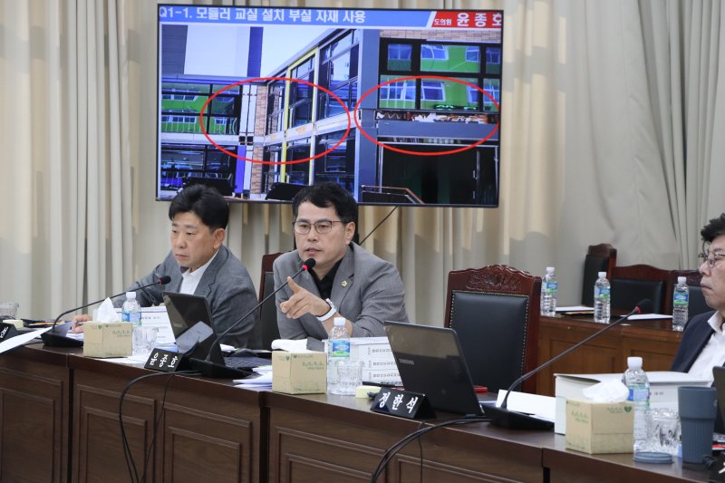 윤 의원은 "학생들이 사용하는 임시교사라는 목적이 동일한 데 어떤 경우는 물건이 되었다가 용역이 되고 또 공사로 바뀌는 건 심각한 문제"며 "발주부서를 일원화하고 철저하게 관리·감독을 추진해야 한다"고 꼬집었다.