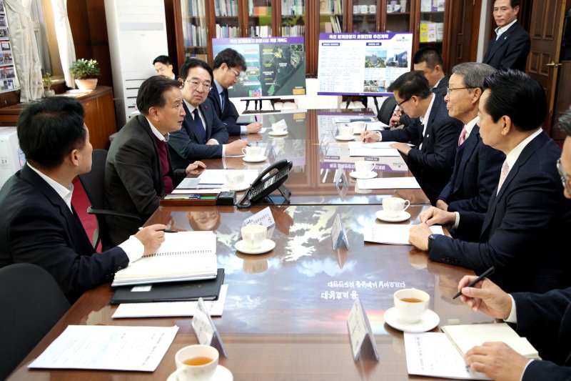 (청주=뉴스1) 김용빈 기자 = 충북도와 옥천군, 인지그룹, 충북개발공사는 7일 옥천 장계관광지 호텔 건립을 위한 첫 기획 회의를 가졌다.