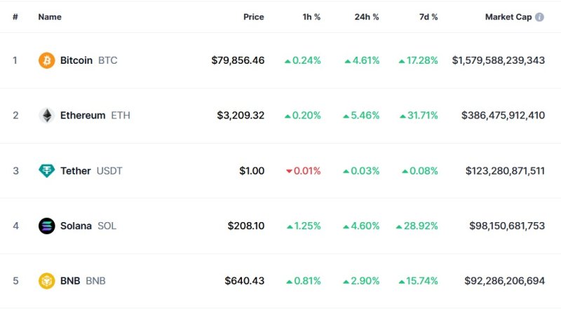비트코인이 급등하자 다른 코인도 일제히 랠리하고 있다. 시총 2위 이더리움은 5.46%, 시총 4위 솔라나는 4.60% 각각 급등하고 있다.