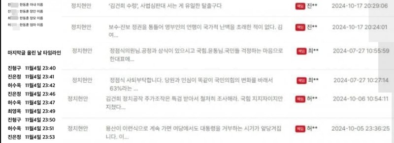 한 대표 가족 이름과 관계, 그들 이름으로 작성한 게시판 글을 뽑아 SNS에 정리한 장 전 최고는 "상식적으로 특이한 이름의 온 가족이 동명이인일 가능성은 매우 낮고 하루가 멀다고 대통령 부부를 비난하던 해당 당원들이 지난 11월 4일 의혹이 제기되자 짜 맞춘 것처럼 글을 쓰지 않았다"며 "이를 볼 때 한동훈 대표의 가족들이 연루됐다는 의심이 커질 수밖에 없다"고 주장했다.