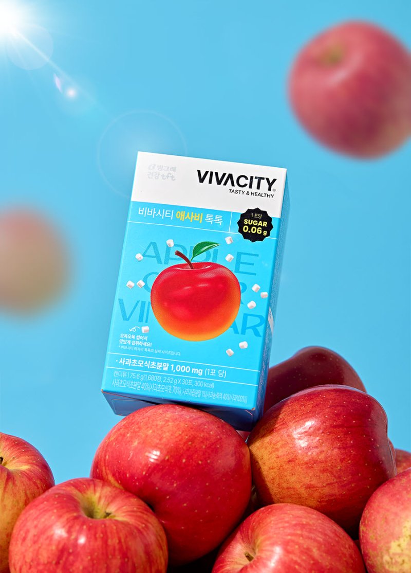 이번 신제품은 1포당 최대 1000㎎ 함량의 사과초모식초분말이 함유됐고, 유산균배양건조물, 레몬밤잎추출분말, 야채혼합농축분말, 비타민, 미네랄 등 엄선된 원료를 추가적으로 배합해 제품을 설계했다.
