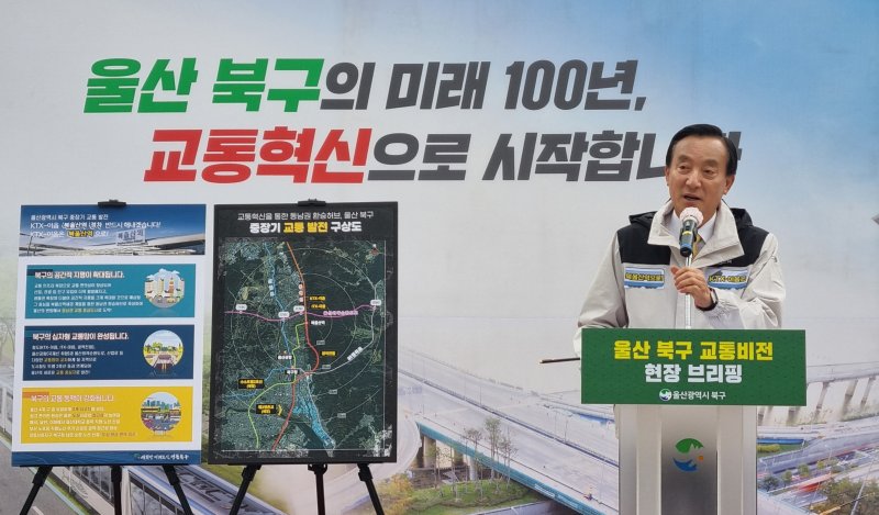 박천동 북구청장이 13일 북울산역 앞에서 언론 브리핑을 통해 최근 변화하고 있는 북구의 교통체계를 설명하고 비전을 공유했다.