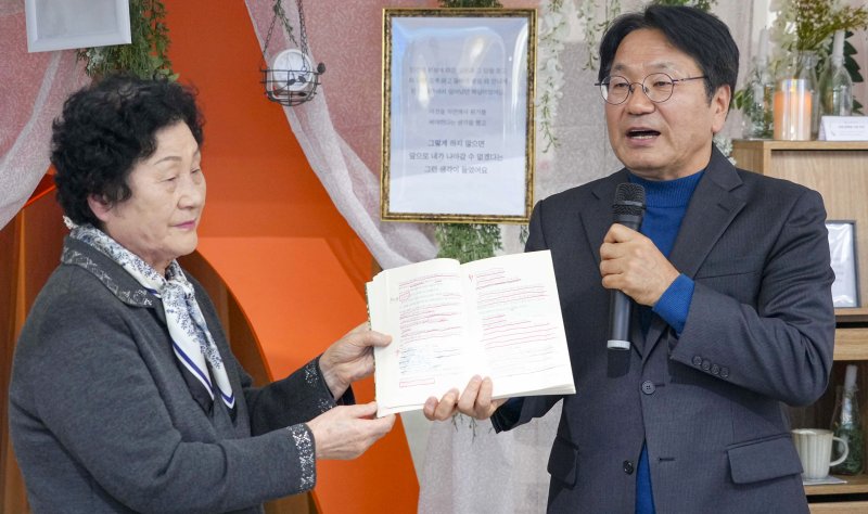 광주시는 문재학 열사의 어머니 김길자씨가 '소년이 온다' 미니북카페 개소식에서 책을 전달했다고 13일 밝혔다.