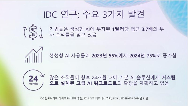AI가 다양한 산업에 걸쳐 실질적인 비즈니스 가치를 창출하고 있는 지표도 확인됐다. 기업들이 생성형 AI에 투자한 금액 1달러당 투자 수익률(ROI)은 평균 3.7에 이르렀다.