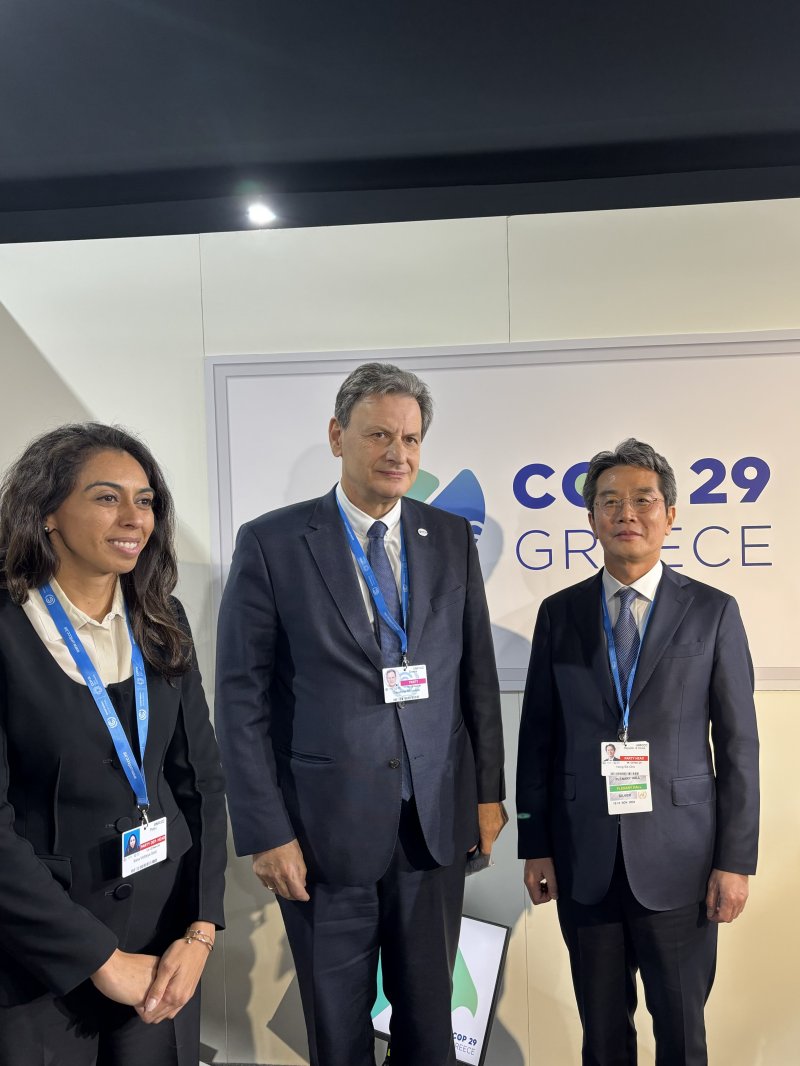 [서울=뉴시스] 박성환 기자 = 조홍식 기후환경대사는 제29차 유엔기후변화협약 당사국총회(COP29·아제르바이잔 바쿠)에 대통령 특사로 참석해 지난 13일 그리스 정부 주관으로 개최된 '우리의 해양, 우리의 행동(Our Ocean, Our Action)' 행사에서 테오도로스 스키라카키스 그리스 환경에너지 장관, 수 비나즈 미국 기후부특사와 함께 내년 우리나라에서 개최되는 제10차 아워 오션 콘퍼런스의 성공적인 개최와 지속가능한 해양을 위한 국제협력 방안을 논의했다.