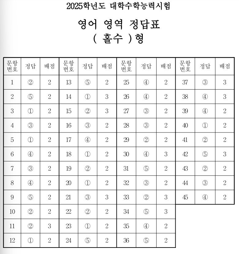 [2025수능] 3교시 영어영역 정답표(홀수형)