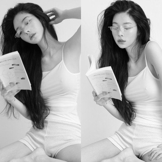 특히 노브라 콘셉트로 안경을 착용한 채 실내에서 독서하는 모습이 담겼다.