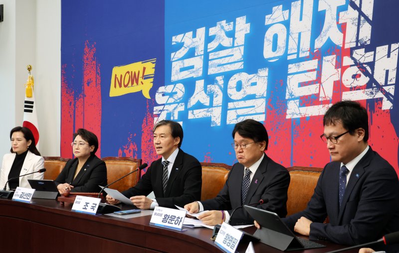 조국 대표는 이날 오전 국회 최고위원회의에서 "(검찰은) 대선 패배 정치인에 대해서는 발언 하나하나를 정밀 분석해 먼지 털듯 수사하고 기소해 1심에서 징역형 선고를 받아냈다"며 “야당, 특히 민주당에 묻는다. 이런 검찰을 그냥 두면 되겠나"라고 말했다.