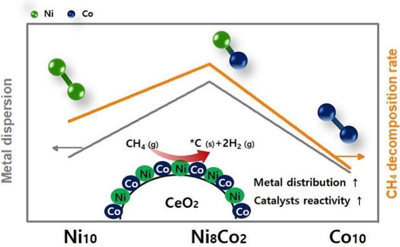 이에 연구진은 니켈 기반 촉매에 코발트를 첨가한 신개념 촉매를 개발하는데 성공했다. 개발된 촉매는 기존에 연구된 촉매에 비해 더 낮은 온도 영역에서 더 높은 효율로 수소를 생산할 수 있다.
