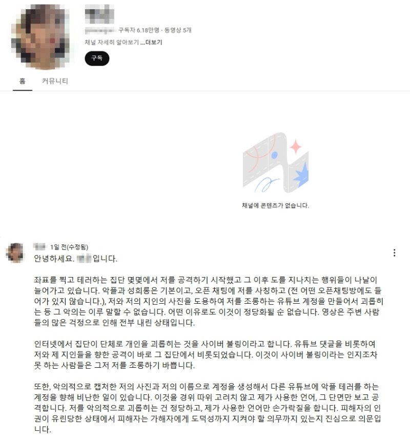 24일 구독자 6만여명을 보유한 유튜버 A씨는 자신의 유튜브 채널 커뮤니티를 통해 이와 관련한 장문의 입장문을 올렸다.