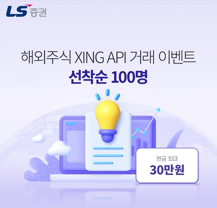 LS증권은 XING API로 해외주식을 일별 30만 달러 이상 거래한 투자자 선착순 100명에게 현금 1만원을 지급한다. 1인당 최대 30만원까지 받을 수 있으며, 대상종목은 미국 증시 상장 주식, 상장지수펀드(ETF), 상장지수증권(ETN)이다.