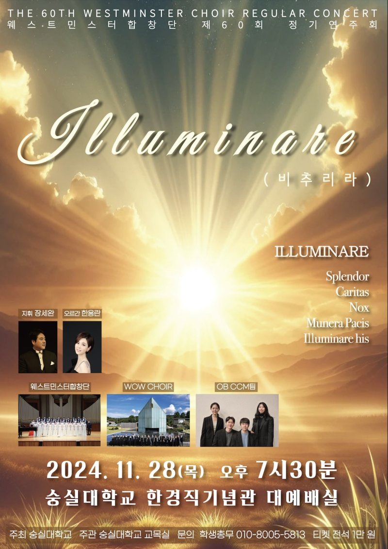 장범식 숭실대 총장은 "웨스트민스터합창단은 지난 66년 동안 음악과 숭실, 그리고 하나님을 사랑하는 마음으로 하나 된 목소리를 모아왔다"며 "이번 연주회도 단원들의 목소리가 모여 아름다운 하모니를 만들어내는 시간이 될 것"이라고 기대감을 전했다.