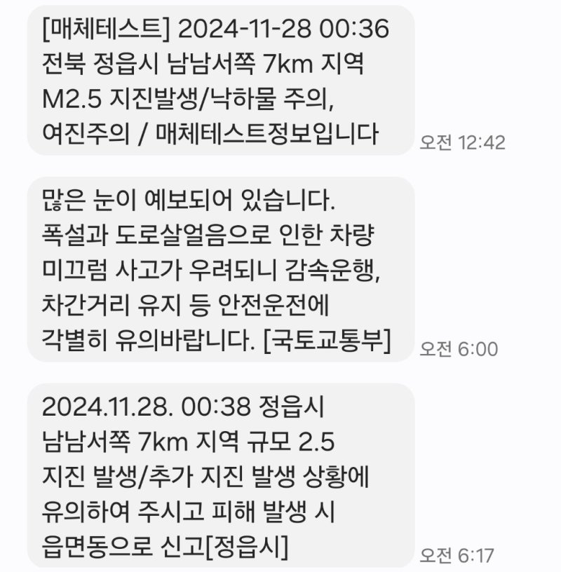 이날 0시42분께 '[매체테스트]'라고 제목이 달린 지진안내문자가 발송됐다. 이에 정읍시는 즉시 정정을 요청했지만 5시간35분만에 해당 재난문자가 정정됐다.