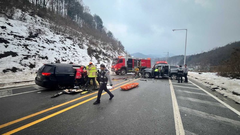 (횡성=뉴스1) 한귀섭 기자 = 2일 오후 3시 56분쯤 강원 횡성 둔내면 마암리의 한 도로에서 A 씨(70대)가 몰던 렉스턴과 B 씨(40대)가 몰던 카니발이 충돌했다.