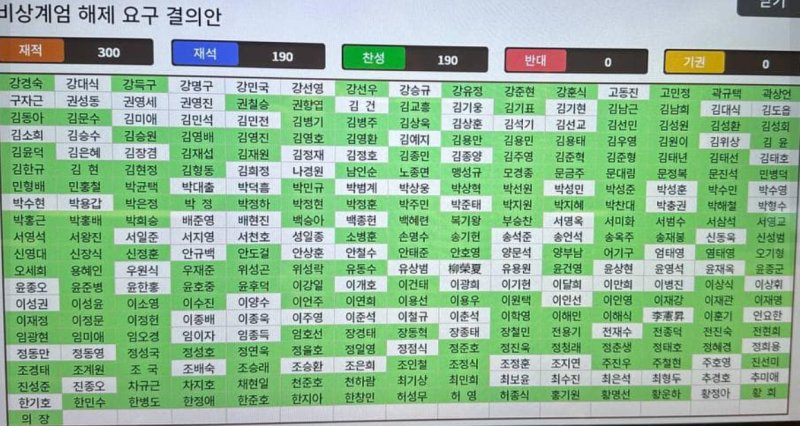계엄군이 국회에 진입한 가운데 진행된 비상계엄 해제 요구 결의안 투표에는 모두 190명이 참석, 법적 요구(국회 재적 의원 과반 찬성시 해제)를 충족한 가운데 출석 190명 모두 해제결의안에 찬성해 통과시켰다.