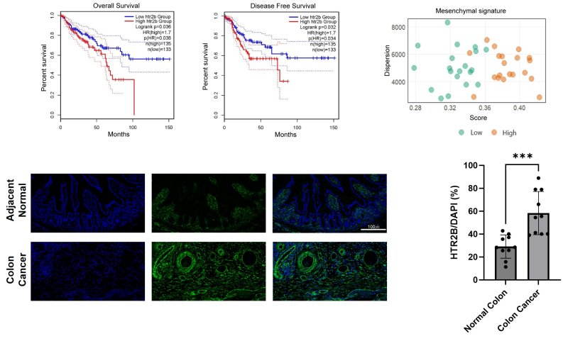 연구팀은 대장암이 아닌 환자와 대장암 환자에서 HTR2B 발현 비율에 따른 사망률을 확인했고 대장암 환자의 조직을 채취한 후 정상 조직과 대장암 조직에서 형광 염색을 통해서 발현 정도를 비교했다.