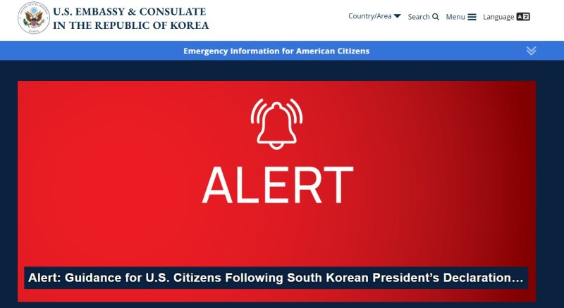 주한 미 대사관은 이날 영문 웹사이트 홈페이지에 적색 경보를 발령하고 '경보: 한국 대통령의 계엄령 선포에 따른 미국 국민을 위한 지침' 안내문을 게재했다.