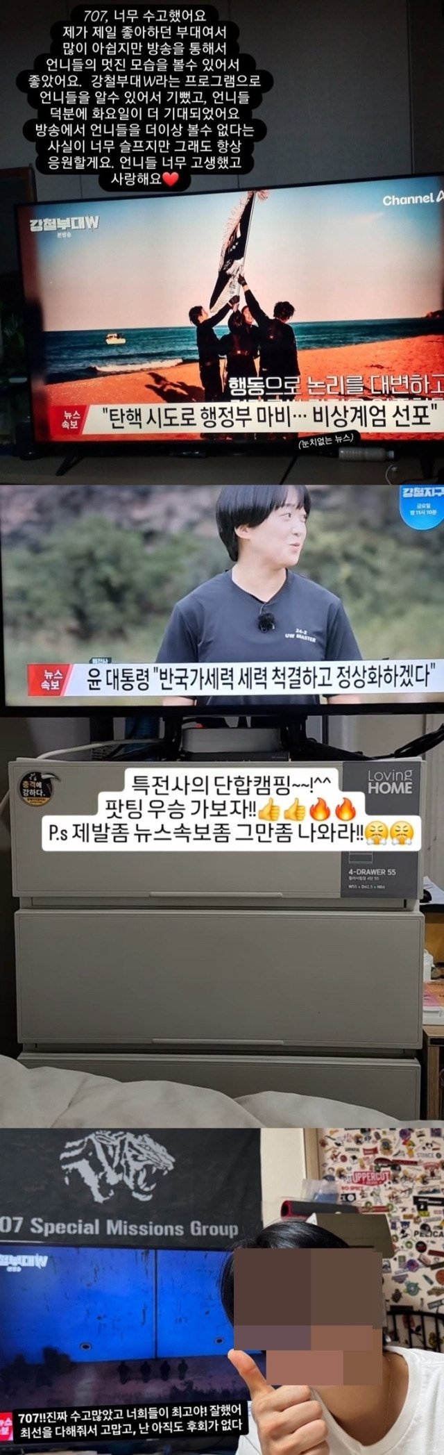 [서울=뉴시스]최인선 인턴 기자 = 윤석열 대통령이 비상계엄을 선포하고 6시간 만에 해제한 가운데 강철부대W 일부 출연진이 "제발 좀 뉴스 속보 좀 그만 좀 나와라"라고 적어 논란이 일었다.