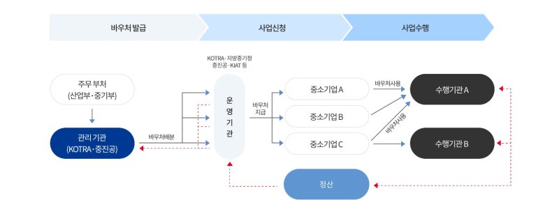 중진공은 수출바우처 사업의 전문성을 제고하고 국가보조금 부정 수급을 예방하기 위해 '수출바우처 총괄수행기관 제도'를 운영 중이다. 각 총괄수행기관은 수출바우처 수행기관 선정과 바우처 서비스 품질 관리를 맡는다.