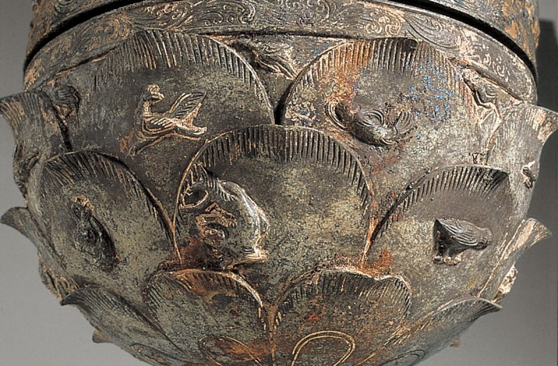 뚜껑에는 산들이 4∼5겹으로 첩첩산중을 이루고 있으며 악기를 연주하는 5명의 악사, 봉황·용을 비롯한 상상 속 짐승, 각양각색의 나무와 바위가 표현돼 있다.