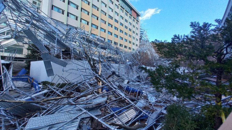 [용인=뉴시스] 양효원 기자 = 6일 오후 2시5분께 경기 용인시 처인구 소재 용인 한국외국어대학교 부설 고등학교 기숙사 공사현장에서 외벽에 설치된 비계(가설물)가 무너져 6명이 다쳤다.