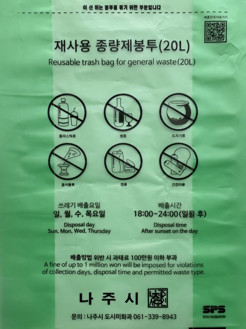 새롭게 판매하는 종량제 봉투는 오는 20일부터 나주시 전역의 종량제 봉투 판매소에서 구매할 수 있다.