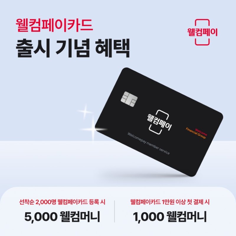 웰컴페이먼츠는 웰컴페이카드 출시를 기념해 오는 12일까지 프로모션을 진행한다. 웰컴페이먼츠는 웰컴페이카드를 발급받은 고객을 대상으로 △선착순 2000명에게 5000웰컴머니 지급하고 △1만원 이상 첫 결제 시 1000웰컴머니를 지급한다.