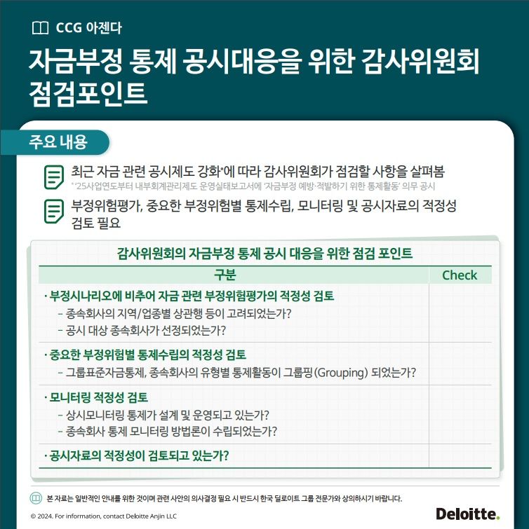 최근 금융당국 자금 관련 공시제도 강화 정책 기조에 따라, 2025년 사업연도부터 상장사와 대형 비상장사는 내부회계관리제도 운영실태보고서에 ‘횡령 등 자금 부정을 예방 및 적발하기 위한 통제활동’을 추가 공시해야 한다.