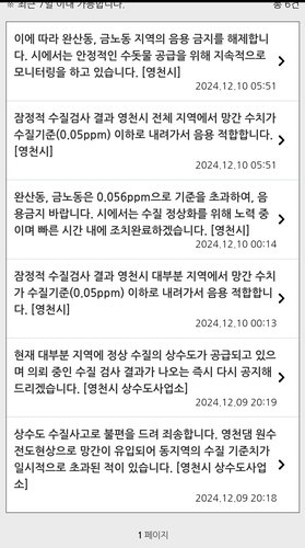 이에 영천시는 오후 6시 18분께 '영천댐 원수 전도현상으로 망간이 유입돼 동 지역의 (망간 수치가) 수질 기준치(0.05ppm)를 일시적으로 초과한 적이 있다'는 취지의 문자를 발송했으며 이날 0시 14분에는 '완산동, 금노동은 0.056ppm으로 기준을 초과해 음용 금지 바란다'고 안내했다.