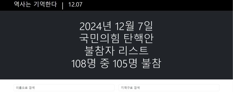 작성자가 공유한 웹사이트는 상단에 '역사는 기억한다 12.07'이라고 적혔고 "2024년 12월 7일 국민의힘 탄핵안 불참자 리스트 108명 중 105명 불참"이라는 제목이 달려있다.
