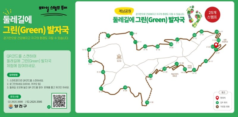 둘레길에 그린 발자국은 둘레길 산책 때 특정 지점에 표출되는 기후·환경, 양천구 생태 문제를 맞혀가며 도장 25개를 모으는 행사다. 문제를 푸는 과정에서 환경 보전에 관한 기본 지식을 습득하고 운동 효과를 누릴 수 있다.