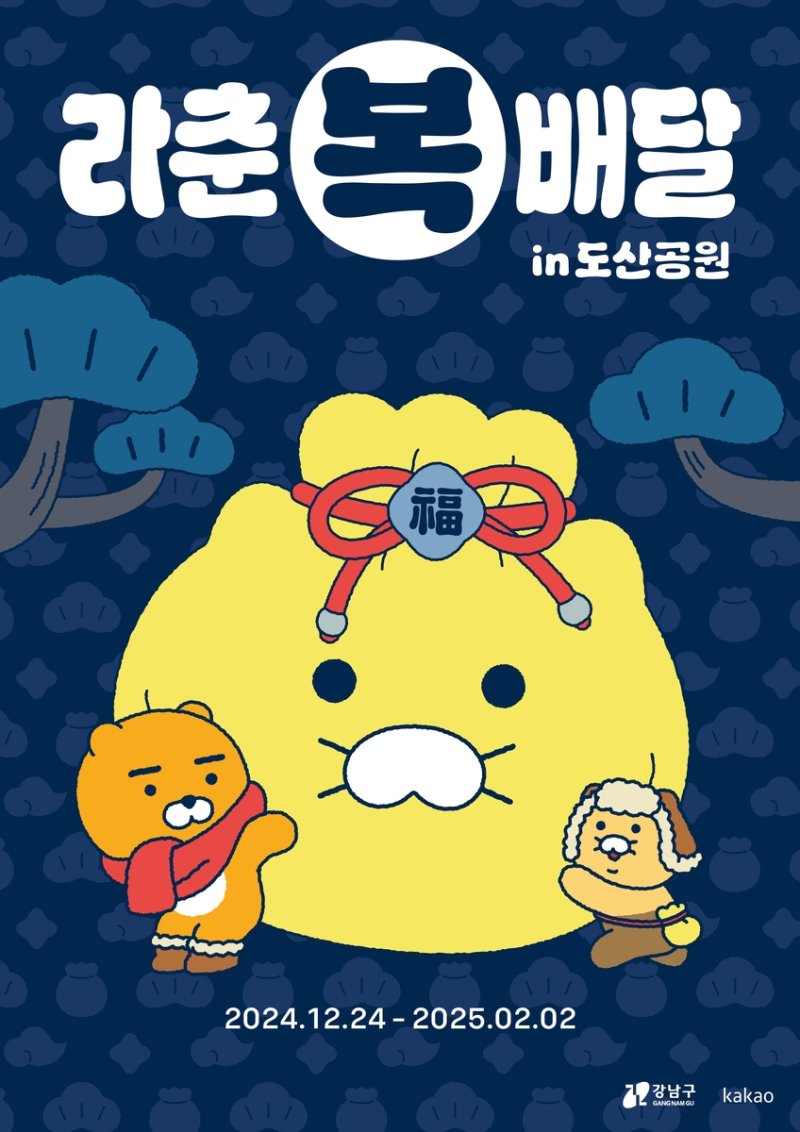 (서울=연합뉴스) 정준영 기자 = 서울 강남구(구청장 조성명)는 ㈜카카오와 손잡고 오는 24일부터 내년 2월 2일까지 도산공원에서 새해맞이 이벤트 '라춘 복 배달'을 개최한다고 16일 밝혔다.