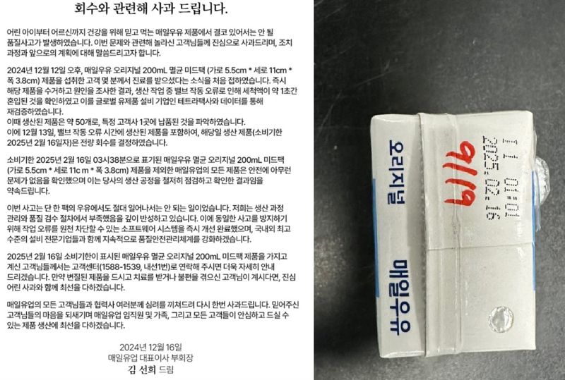 이어 "이번 사고는 단 한 팩의 우유에서도 절대 일어나서는 안 되는 일이었다"며 "생산 과정 관리와 품질 검수 절차에서 부족했음을 깊이 반성하고 있다"고 전했다.