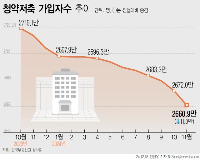 18일 한국부동산원 청약홈에 따르면 11월 말 기준 청약통장 가입자 수는 2660만9366명으로, 전월(2671만9542명) 대비 11만176명이 감소했다.