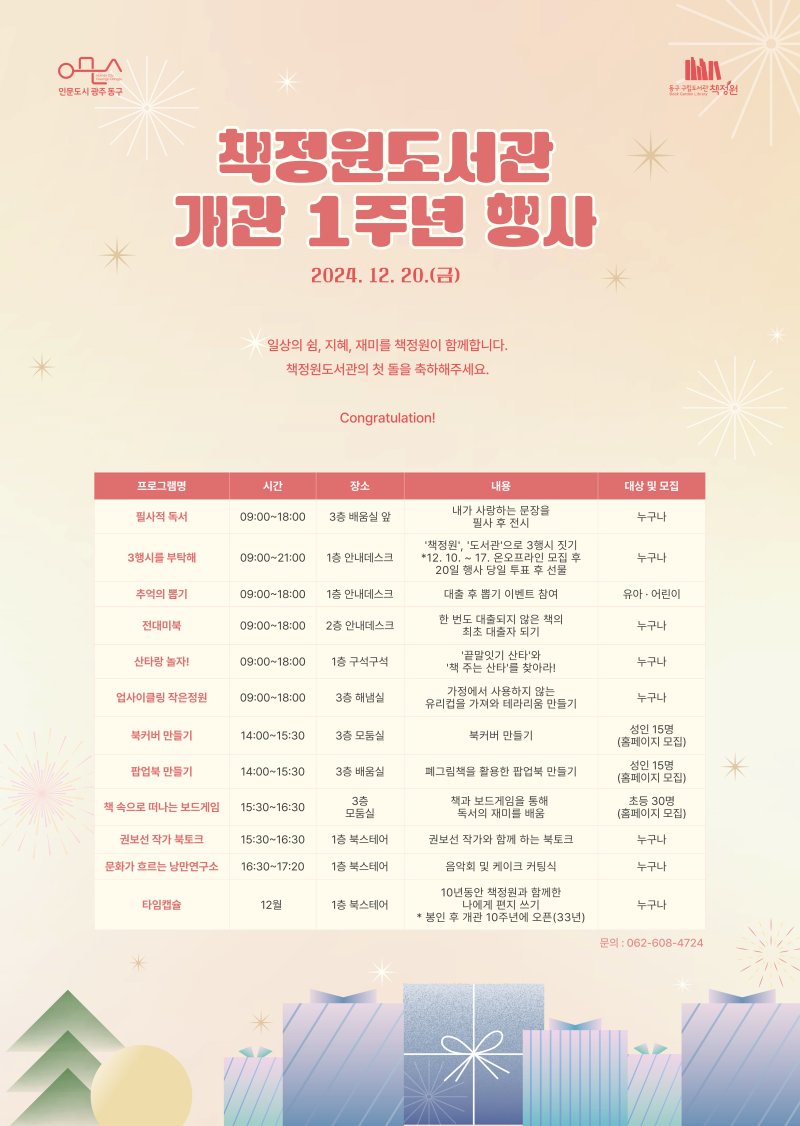 임택 동구청장은 "책정원 첫돌을 맞아 다양한 축하 행사를 준비했다"며 "주민들이 친근하게 다가갈 수 있는 문화시설이자 독서문화 소통 공간으로 자리잡을 수 있게 노력하겠다"고 말했다.