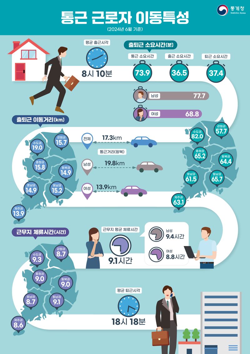 20일 통계청 ‘2024년 통근 근로자의 이동특성 실험통계’에 따르면 통근 근로자의 평균 출・퇴근 소요시간은 73.9분이다. 출근과 퇴근 시 소요시간은 각각 36.5분, 37.4분이 걸린다. 남성(77.7분)은 여성(68.8분)보다 9분 통근 시간이 더 걸렸다.