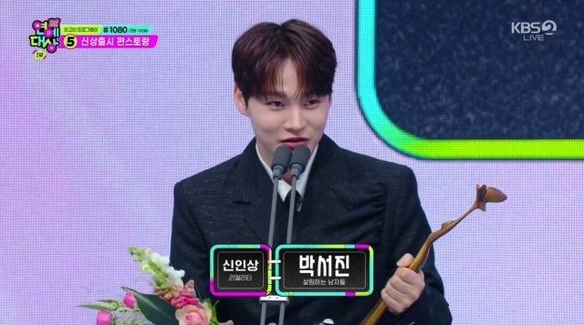 박서진은 21일 서울 여의도 KBS 신관 공개홀에서 열린 '2024 KBS 연예대상'에서 '살림하는 남자들' 시즌2로 리얼리티 부문 신인상을 받았다. 배우 이상우도 '신상출시 편스토랑'에서 활약, 함께 수상했다.