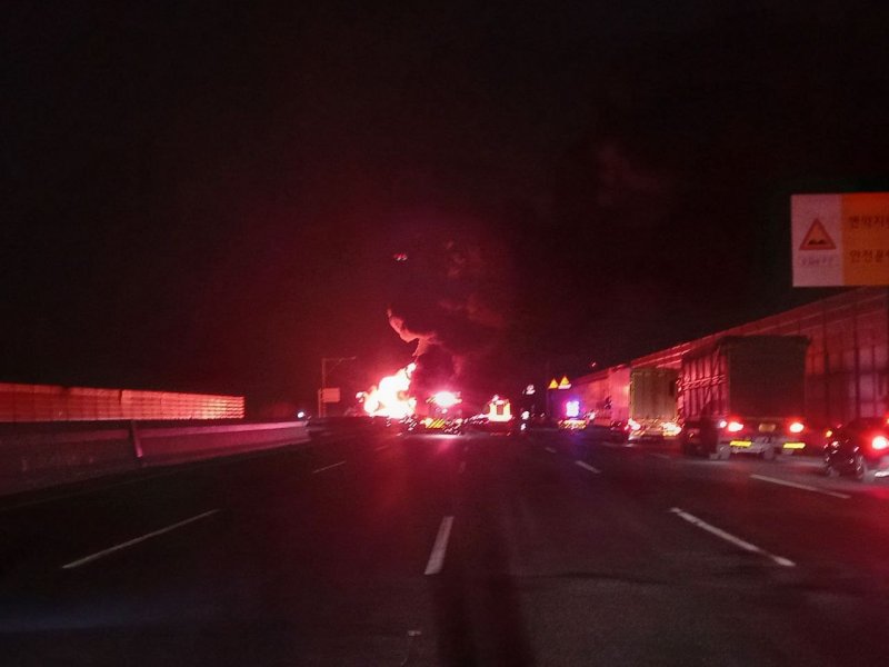 (평택=뉴스1) 박대준 기자 = 23일 오후 9시 50분께 경기 평택시 포승읍 서해안고속도로 목포방향 서평택IC 인근에서 유조차량이 가드레일을 들이박고 넘어져 화재가 발생했다.
