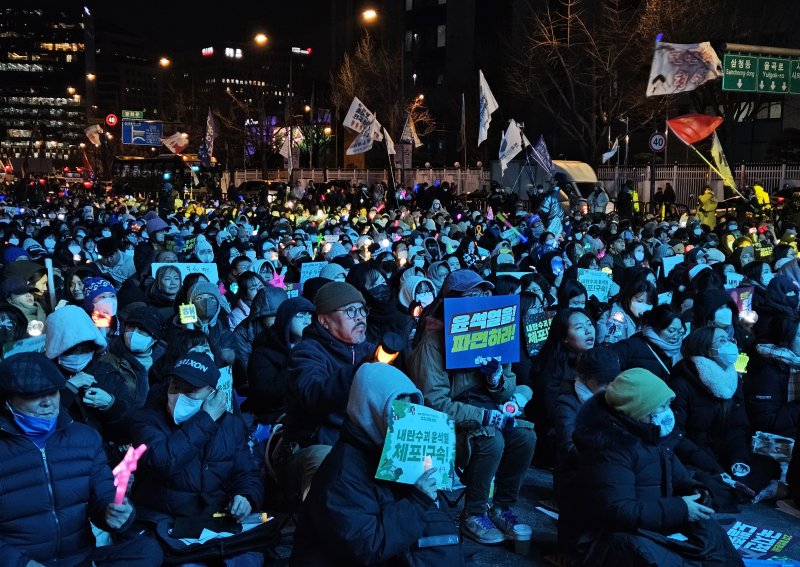 경기 부천에서 온 서이슬씨는 "아이를 포함해 우리 가족 셋은 작은 케이크로 생일(12월14일) 축하를 하곤 했다"며 "아이에게 올해 무슨 케이크를 살지 물으니 '탄핵 가결'이 생일 선물이라고 답했다"고 울먹였다.