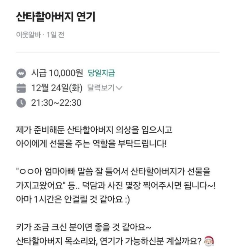 공고에 따르면 "일일 산타 할아버지 연기할 사람을 모집한다"며 "준비해 둔 산타 할아버지 의상을 입고 아이에게 선물 주는 역할이다"라고 적혀있다.