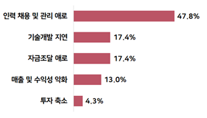이들 기업이 규제로 경험한 애로사항으로는 ‘인력 채용 및 관리 애로’가 47.8%로 가장 많았다.