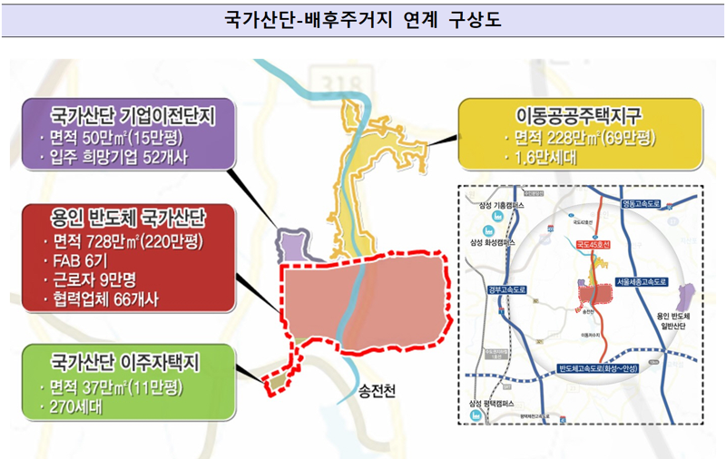 용인 반도체 국가산단은 반도체산업 특수성을 고려한 특화 산단으로 설계한다. 배후주거지인 이동공공주택지구는 주거와 문화의 중심지로 육성하는 등 직·주·락 기능이 결합된 ‘산업중심 복합도시’로 조성한다.