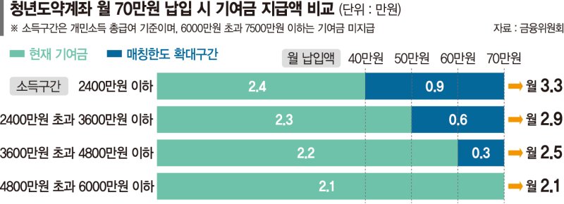 내년 1월부터는 모든 소득구간에서 매칭한도가 납입한도까지 확대된다. 확대된 구간(월 40만~70만원, 월 50만~70만원, 월 60만~70만원)에는 매칭비율 3.0%를 적용해 기여금을 지급한다. 이에 따라 개인소득 2400만원 이하 청년이 향후 월 70만원을 낼 경우 매칭한도 확대구간(월 40~70만원)에도 기여금(매칭비율 3.0%)이 지급돼 월 3만3000원의 기여금을 받게 된다. 금융위는 "이 경우 가입자가 만기시 수령하는 금액은 최대 60만원 증가해 연 9.54%의 일반 적금에 가입한 것과 같은 수익 효과를 낼 수 있다"고 설명했다.