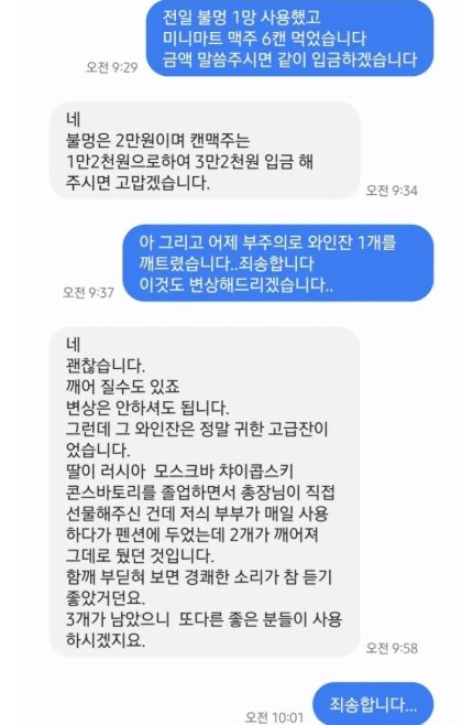[서울=뉴시스]황소정 인턴 기자 = 부주의로 숙소에 있던 와인잔을 깨뜨려 우려하는 손님과 사장님이 나눈 대화 내용이 화제다.
