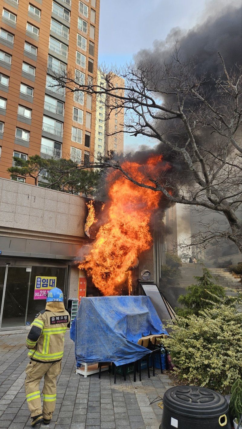 (청주=뉴스1) 이재규 기자 = 27일 낮 1시 40분쯤 충북 청주시 흥덕구 가경동의 한 아파트 앞 상가단지에서 화재가 발생했다.